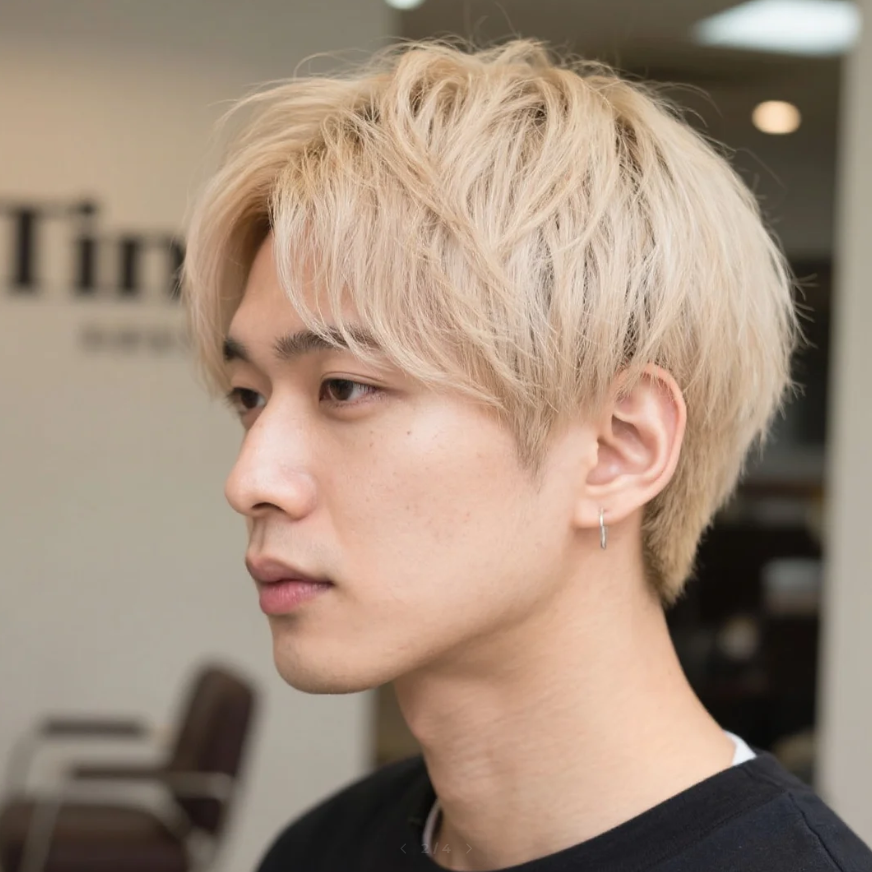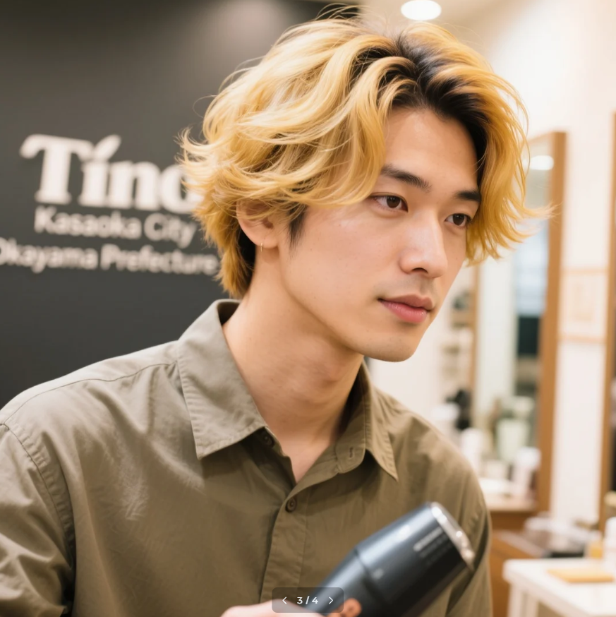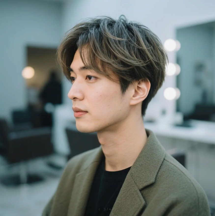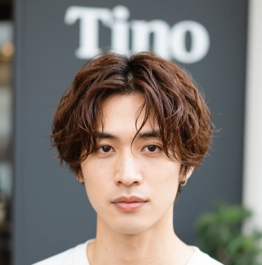 サイドを短く、トップをテクスチャーで動きを。オイルで艶出し。