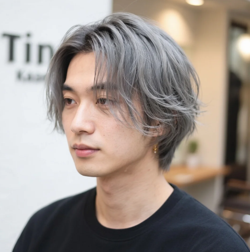 濡れ髪で分け目をクセづけ、グリースで束感を。毛先を軽くワンカールで韓国風に。
