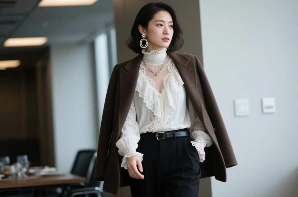 このスタイルは、2025冬のレーストレンド(ChloéやDiorの影響)を活かし、ゴシックロマンティックな雰囲気をモダンに昇華させたもの。30代のビジネスシーンにぴったりで、レイヤードで防寒性を高めています。 トップス: 白のヴィンテージ風レースブラウス(袖に繊細なフリル入り)。首元を少し開けてフェミニンさを強調。