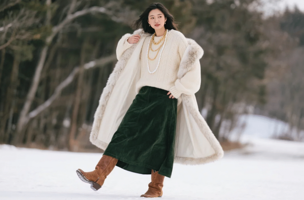 解説: ジュエルカラーの鮮やかさが冬のモノトーンを打破し、ステートメントコートが主役に。30代らしいパーソナルエクスプレッションを体現し、暖かさはコートの厚手ウールで確保。総額目安:4-5万円。カラーパレットを統一すればコーデが簡単で、自信をブースト。