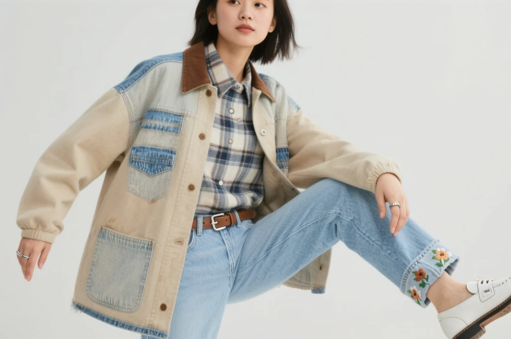 バギージーンズの継続トレンドとバーンジャケットをデニム中心にアレンジした、アメリカーナ風カジュアル。30代の日常通勤やショッピングにフィットし、クラシックながら新鮮。 トップス: チェック柄のフランネルシャツ(オーバーサイズでレイヤード)。