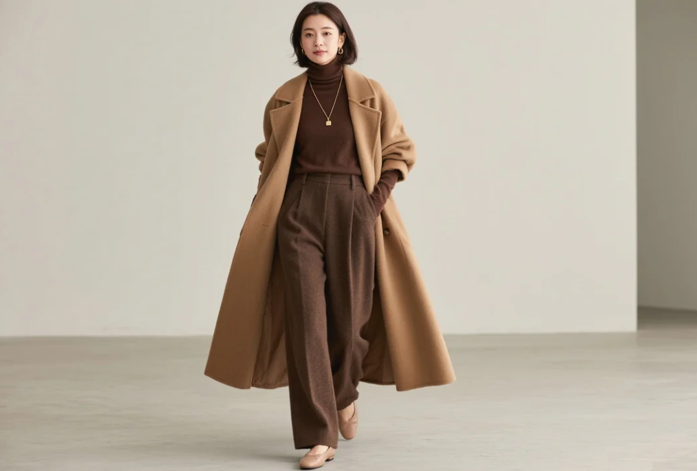 ステルス・ウェルスとモカカラートレンドを基調に、スレイプド(ゆったり)シルエットで構築したミニマリストスタイル。30代のオフィスカジュアルや旅行に適し、控えめなエレガンスが光る。 トップス: モカブラウンのカシミヤタートルネック(ハイネックで防寒)。