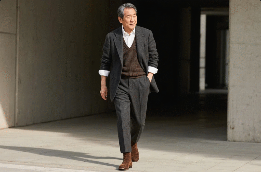 ダークグレーまたはネイビーのウールブレザー(ワイドラペル仕様) + ストレートフィットのパンツ(軽くテーパード) + ヘビーウェイトのオックスフォードシャツ(白または淡いブルー) + ブラウンスエードのチェルシーブーツ。