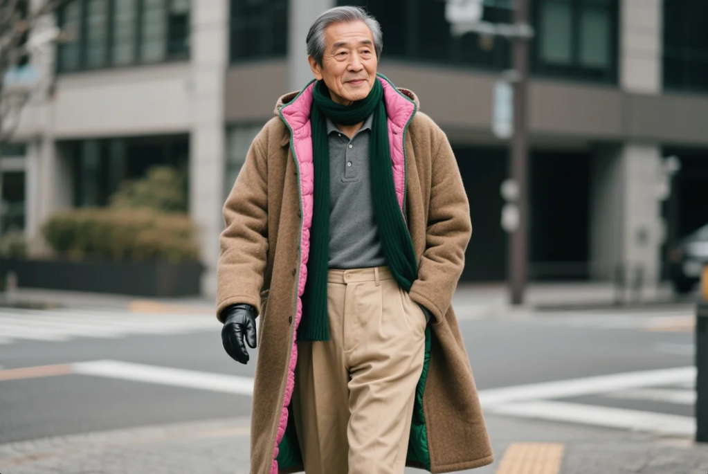 コートは保温性の高いウールやダウン混紡を選び、肩パッドを控えめにしたリラックスフィットで体型をカバー。