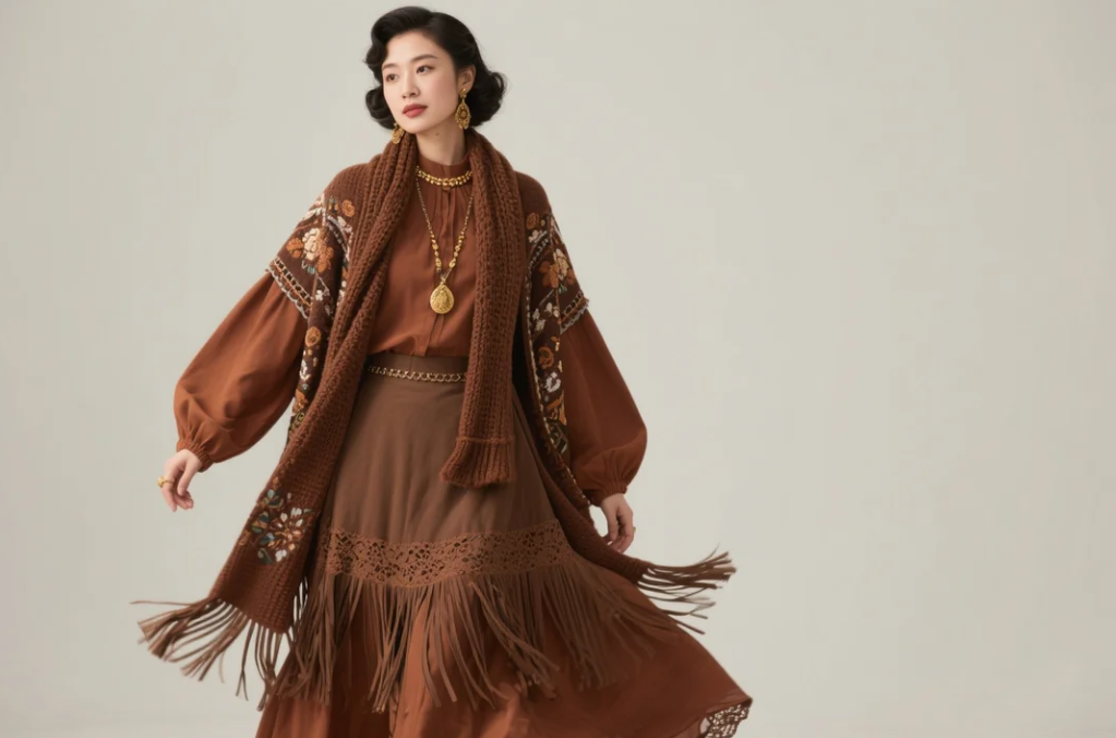 フロウイングなブラウスやエンブロイダリージャケットをマキシスカートに合わせ、フリンジやレースのディテールを加えます。
