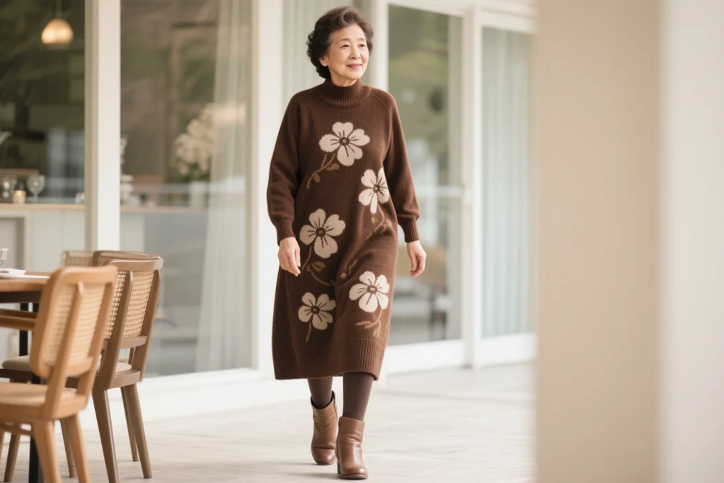 厚手のニットやウール素材のロングドレスで、膝下まで覆う丈が50代の体型を美しく見せます。