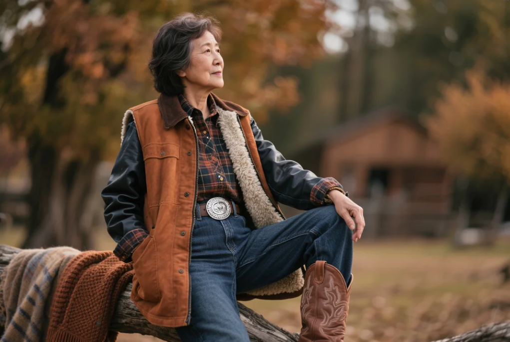 チョアジャケット(作業着風のショートジャケット)をデニムパンツやフレンジ付きスカートに重ね、カウボーイブーツで締めるスタイルです。