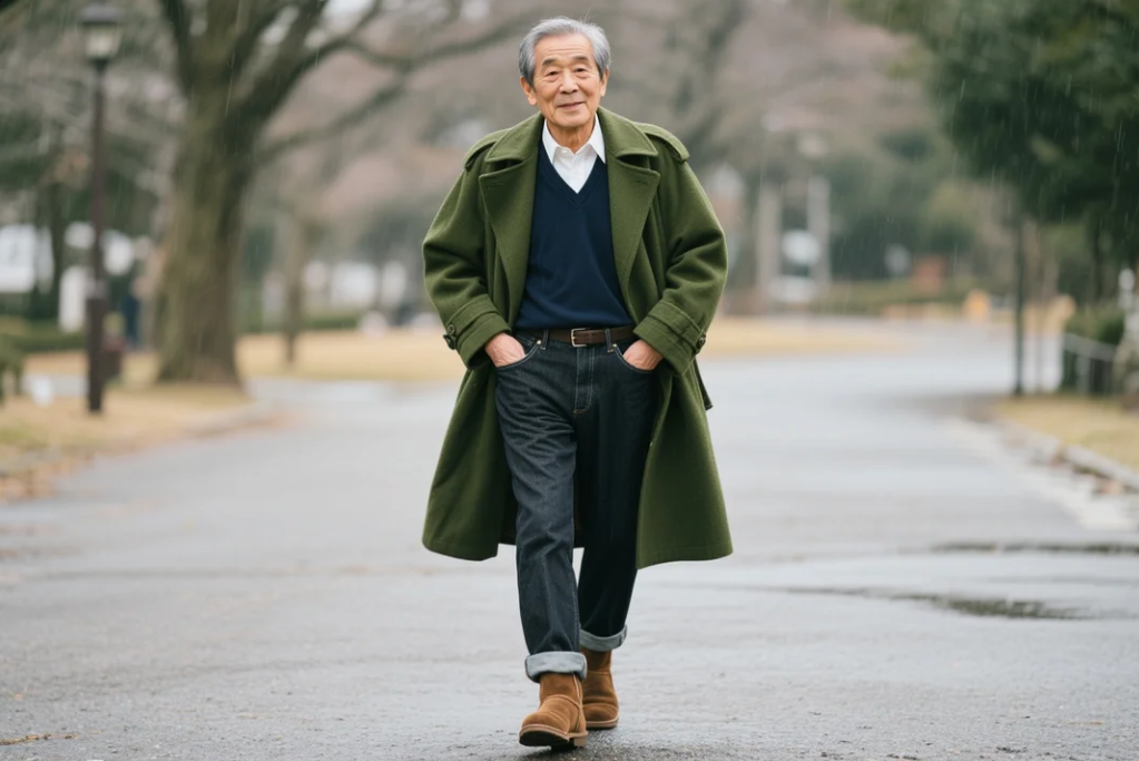 パンツはルーズだが裾を絞ってシルエット調整し、ブーツで防寒。60代向けに、過度なダメージを避けクリーンな仕立てを選ぶのがポイント。