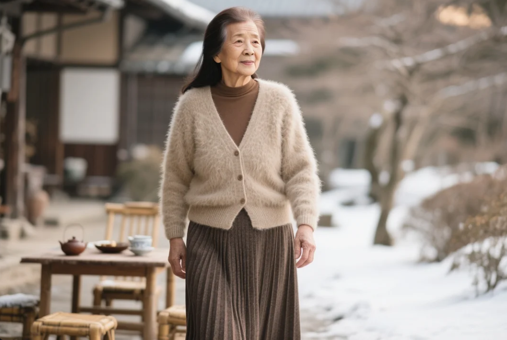 スカートはウール素材のミディ丈で、プリーツの動きが優雅さを加え、膝下丈で60代の品格を保つ。