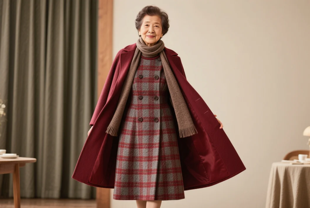 特別なディナーや年末の集まりにぴったりで、チェックの柄が60代のエレガントさを引き立てる。