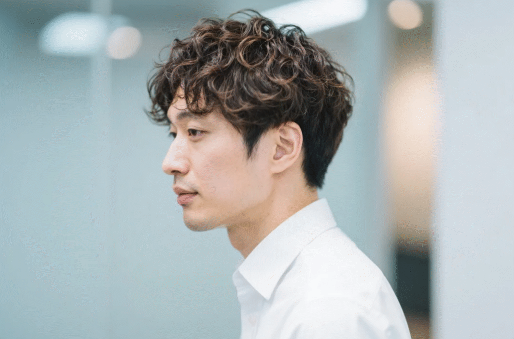 詳細: サイドとバックはスッキリと刈り上げ、トップは長さを残しすぎず、ニュアンスパーマをかけます。このパーマは強くカールさせるのではなく、毛流れを作り、くせ毛のような自然な動きと質感を出すためのものです。